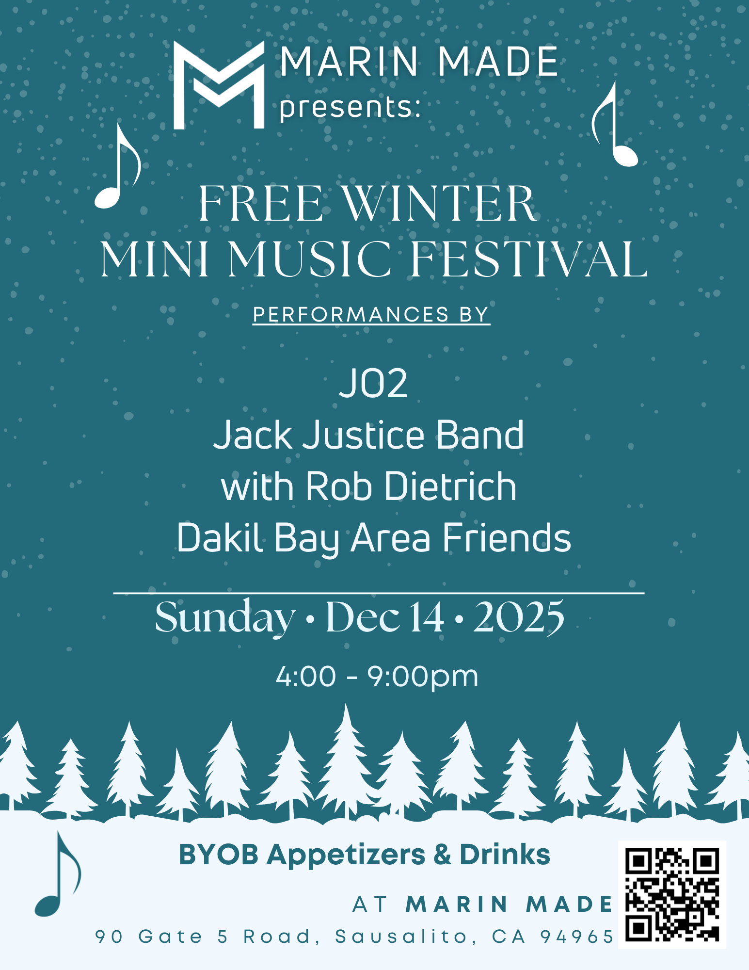 Dec 14 4:00 PM16:00 Music Festival Sunday, December 14, 2025 4:00 PM 9:00 PM 16:00 21:00 Marin MADE (map) Google Calendar ICS MARIN MADE presentsFree Winter Mini Music Festival Performances byJO2Jack Justice Band with Rob Dietrich Dakil Bay Area Friends View Event →
